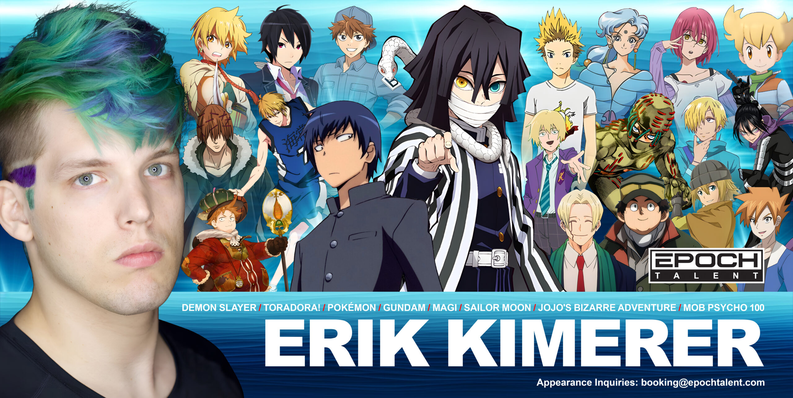 Erik Scott Kimerer was born and raised in Edmonds, WA, a suburb of Seattle. After graduating in Theatre from the University of Puget Sound, he moved to Los Angeles to pursue acting in the formats he’s most passionate about. He found early success, taking the lead in nostalgic shows such as Accel World (Haruyuki Arita), Magi (Alibaba Saluja) & Toradora! (Ryuuji Takasu), and would later join many popular, genre-defining series such as Seven Deadly Sins (Gowther), One Punch Man (Speed-o’-Sound Sonic) & Demon Slayer (Iguro Obanai). Later in his career, Erik felt a pull to return to live acting in some manner, and would re-discover his love of professional wrestling in a more hands on way. From there he started training and performing for yet another storytelling stage he’s attached to. He continues his journey of letting the voices in his head out (in healthy ways) and making his younger self as jealous as possible.